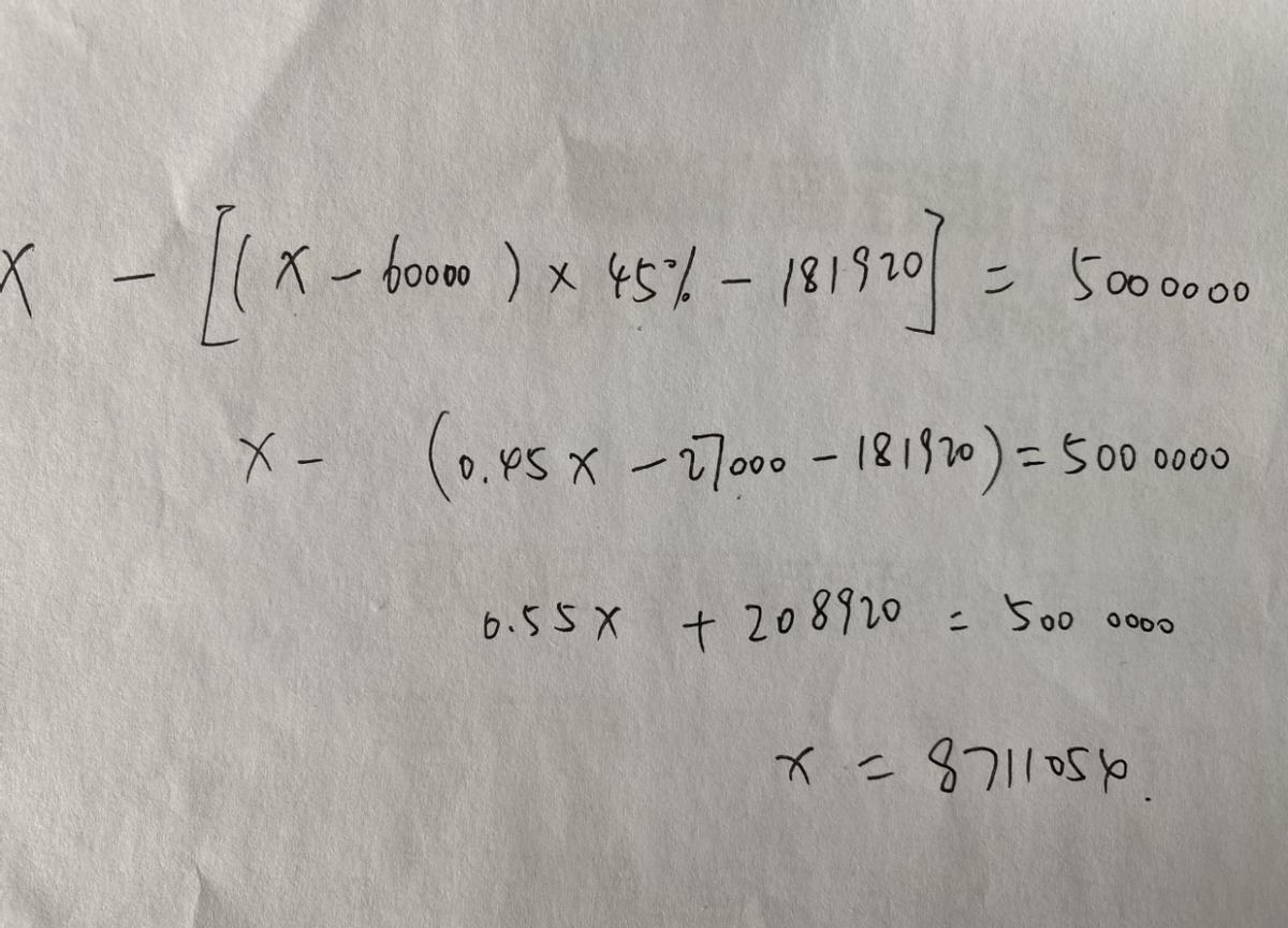 首先是李梦的年薪,有消息称是税后500万元,税前的收入,应该是871万元。这点可以参考下图,x代表税前金额、60000代表年个税起征点、45%代表超过96万元收入部分的税率、181920代表96万收入部分的扣除数。