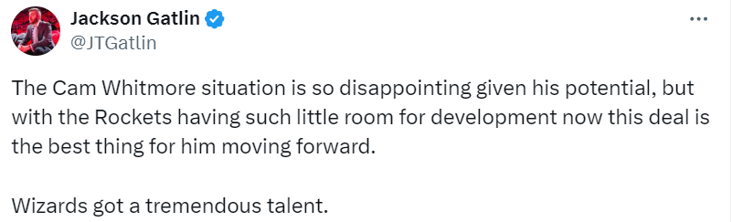 北京时间7月6日,据名记Shams报道,火箭队已同意将前锋卡姆-惠特莫尔交易至奇才队,换回了两个次轮签(2026年公牛的次轮签和2029年国王的次轮签)。这笔交易引起热议,火箭多位媒体人发表了自己的看法。