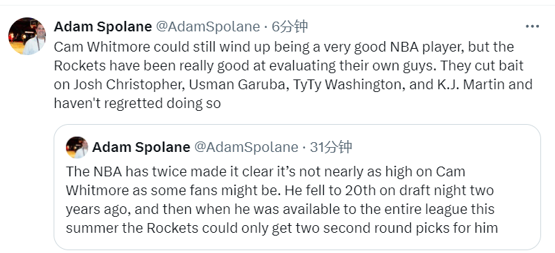 火箭队记Spolane表示:“NBA联盟已两次明确表明,他们对惠特莫尔的评价远不及部分球迷那般高。两年前的选秀夜,他一路跌至第20顺位;而今年夏天,当他被摆上货架时,火箭队也仅能为他换回两个次轮签。惠特莫尔或许仍能成长为一名非常出色的NBA球员,但火箭队在评估自家球员方面向来眼光独到。他们当初果断放弃乔克里斯托弗、加鲁巴、泰泰-华盛顿和KJ-马丁,事后也从未后悔过。”
