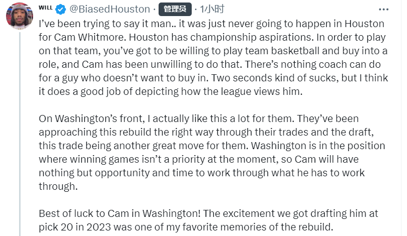 火箭媒体人Will则表示,无论换来的回报如何,送走惠特莫尔是火箭不得不做出的决定。他写道——